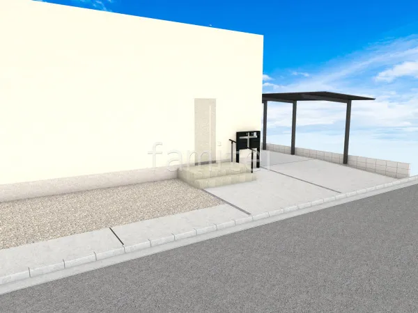 機能門柱は三協アルミ フレムスClassic 2型を採用。2世帯用の機能門柱になっており、別々に郵便物を受け取ることができます。駐車場スペースにはカーポート LIXIL ネスカF 縦2台用と、フーゴFテラスを設置。車や自転車、バイクを雨や紫外線から守ることができます。