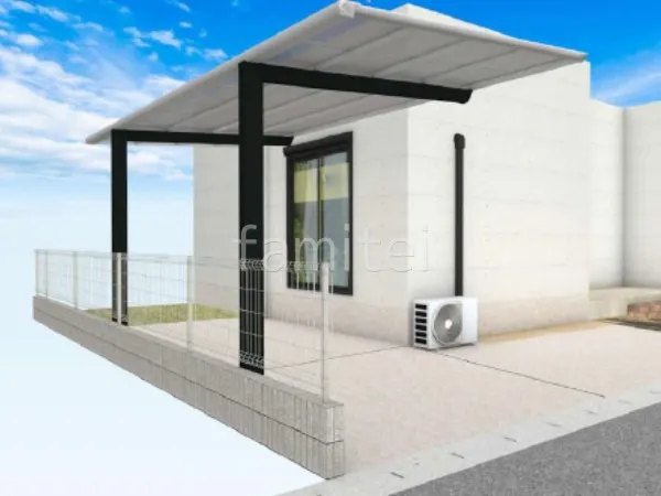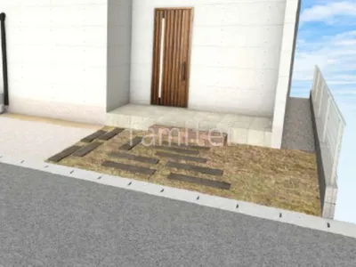 駐車スペースに1台用カーポート 三協アルミ セルフィを設置し、シンプルでスタイリッシュなデザインで雨や日差しから車を守ります。 さらに、既存の土間コンクリートの一部を解体し、天然芝と枕木を組み合わせてアプローチを拡張し、芝の柔らかな緑と木材の温かみで景観の美しさをプラスしました。